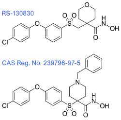 These inhibitors were followed by the next group of hydroxamate-based inhibitors, which focus on the suppression of metabolism, minimization of MMP-1 inhibitory activity and the control of subtype selectivity, by structure-based design. The tetrahydropyran in RS-130830 introduces a steric block that suppresses metabolism, which would fix the problem that the previous generation of inhibitors showed. The outcome of its clinical evaluation has not yet been disclosed. 239796-97-5 has improved ADME and MMP-1 selectivity properties and has shown excellent oral efficacy in an animal model of osteoarthritis. Although, the therapeutic objectives for these inhibitors is not cancer, like it has been for most of the MMP inhibitors.[7]