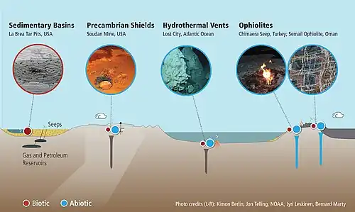- ↑ Kietäväinen and Purkamo (2015). "The origin, source, and cycling of methane in deep crystalline rock biosphere". Front. Microbiol. 6: 725. doi:10.3389/fmicb.2015.00725. PMC 4505394. PMID 26236303.