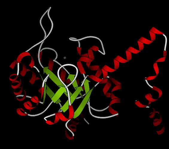 The following still shot from a ribbon kinemage shows one subunit from the crystal structure 1MUM, which includes a magnesium ion (gray) but no substrate; helices are red while loops are white and beta strands are green.