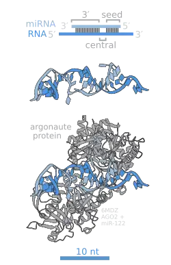 Micro ribonucleic acid (microRNA, miRNA, μRNA) are small, single-stranded, non-coding RNA molecules containing 21–23 nucleotides.[1] Found in plants, animals, and even some viruses, miRNAs are involved in RNA silencing and post-transcriptional regulation of gene expression.[2][3] miRNAs base-pair to complementary sequences in messenger RNA (mRNA) molecules,[4] then silence said mRNA molecules by one or more of the following processes:[1][5]