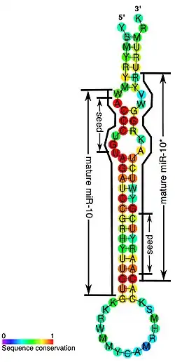 A miRNA can be derived from each arm of the pre-miRNA hairpin. Historically, the least common of these two miRNA products was denoted by the addition of * to the miRNA name, however the modern convention is to denote mature miRNA products as 5p or 3p.[11] Both mir-10 and mir-10* have been detected in Drosophila. There are many potential targets for miR-10* in Drosophila, including several Hox genes, indicating that miR-10* may also be functional.[12][13] In Drosophila most mature miR-10 sequences are produced from the 3' arm of the precursor while in the beetle Tribolium castaneum most production comes from the 5' arm.[14] These changes of arm preference during evolution are termed arm switching events, and they are relatively frequent during the evolution of microRNAs.[14][15]