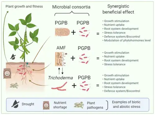 The diagram on the right illustrates that rhizosphere microorganisms like plant-growth-promoting bacteria (PGPB), arbuscular mycorrhizal fungi (AMF), and fungi from the genus Trichoderma spp. can establish beneficial interactions with plants, promoting plant growth and development, increasing the plant defense system against pathogens, promoting nutrient uptake, and enhancing tolerance to different environmental stresses. Rhizosphere microorganisms can influence one another, and the resulting consortia of PGPB + PGPB (e.g., a nitrogen-fixing bacterium such as Rhizobium spp. and Pseudomonas fluorescens), AMF + PGPB, and Trichoderma + PGPB may have synergetic effects on plant growth and fitness, providing the plant with enhanced benefits to overcome biotic and abiotic stress. Dashed arrows indicate beneficial interactions between AMF and Trichoderma.[31]