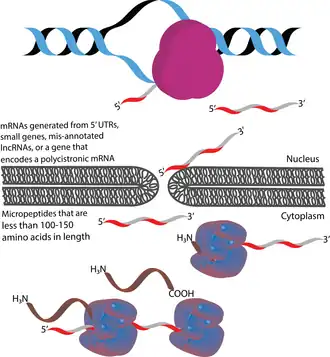 Micropeptides (also referred to as microproteins) are polypeptides with a length of less than 100-150 amino acids that are encoded by short open reading frames (sORFs).[1][2][3] In this respect, they differ from many other active small polypeptides, which are produced through the posttranslational cleavage of larger polypeptides.[1][4] In terms of size, micropeptides are considerably shorter than "canonical" proteins, which have an average length of 330 and 449 amino acids in prokaryotes and eukaryotes, respectively.[5] Micropeptides are sometimes named according to their genomic location. For example, the translated product of an upstream open reading frame (uORF) might be called a uORF-encoded peptide (uPEP).[6] Micropeptides lack an N-terminal signaling sequences, suggesting that they are likely to be localized to the cytoplasm.[1] However, some micropeptides have been found in other cell compartments, as indicated by the existence of transmembrane micropeptides.[7][8] They are found in both prokaryotes and eukaryotes.[1][9][10] The sORFs from which micropeptides are translated can be encoded in 5' UTRs, small genes, or polycistronic mRNAs. Some micropeptide-coding genes were originally mis-annotated as long non-coding RNAs (lncRNAs).[11]