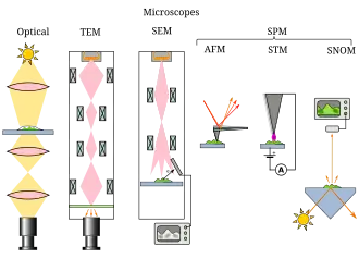 The different types of scanning probe microscopes arise from the many different types of interactions that occur when a small probe is scanned over and interacts with a specimen. These interactions or modes can be recorded or mapped as function of location on the surface to form a characterization map. The three most common types of scanning probe microscopes are atomic force microscopes (AFM), near-field scanning optical microscopes (NSOM or SNOM, scanning near-field optical microscopy), and scanning tunneling microscopes (STM).[28] An atomic force microscope has a fine probe, usually of silicon or silicon nitride, attached to a cantilever; the probe is scanned over the surface of the sample, and the forces that cause an interaction between the probe and the surface of the sample are measured and mapped. A near-field scanning optical microscope is similar to an AFM but its probe consists of a light source in an optical fiber covered with a tip that has usually an aperture for the light to pass through. The microscope can capture either transmitted or reflected light to measure very localized optical properties of the surface, commonly of a biological specimen. Scanning tunneling microscopes have a metal tip with a single apical atom; the tip is attached to a tube through which a current flows.[29] The tip is scanned over the surface of a conductive sample until a tunneling current flows; the current is kept constant by computer movement of the tip and an image is formed by the recorded movements of the tip.[28]