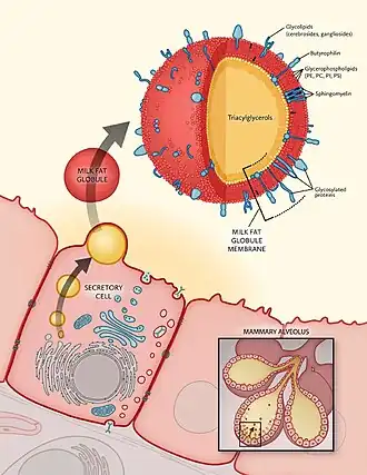 - ↑ Bourlieu C, Michalski MC (March 2015). "Structure-function relationship of the milk fat globule". Current Opinion in Clinical Nutrition and Metabolic Care. 18 (2): 118–127. doi:10.1097/MCO.0000000000000138. PMID 25581036. S2CID 1964967.