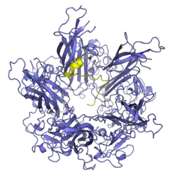 Both VP2 and VP3 are primarily intrinsically unstructured proteins; they have DNA-binding domains[6] and a nuclear localization signal at their C-terminal ends.[7] Both VP2 and VP3 bind to the interior of VP1 pentamers in the assembled capsid.[1][2] It is generally believed that the stoichiometry of this interaction is one molecule of VP2 or VP3 to each VP1 pentamer,[2] though higher ratios have sometimes been reported, possibly indicating that pentamers can accommodate associations with two minor proteins.[3]