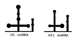 {{cite journal}}: CS1 maint: DOI inactive as of March 2025 (link) - ↑ Tarn WY, Steitz JA (1996). "Highly diverged U4 and U6 small nuclear RNAs required for splicing rare AT-AC introns". Science. 273 (5283): 1824–32. Bibcode:1996Sci...273.1824T. doi:10.1126/science.273.5283.1824. PMID 8791582. S2CID 2638546.