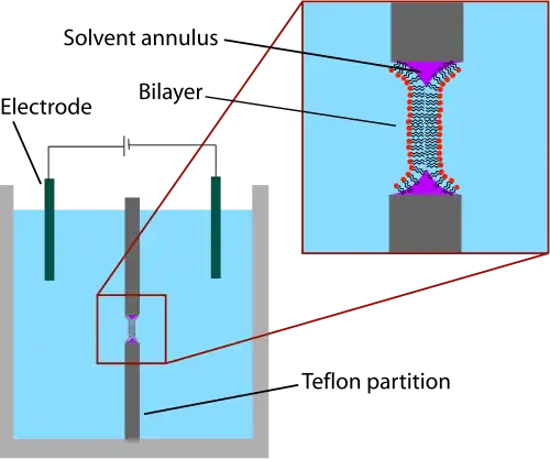 The term “black” bilayer refers to the fact that they are dark in reflected light because the thickness of the membrane is only a few nanometers, so light reflecting off the back face destructively interferes with light reflecting off the front face. Indeed, this was one of the first clues that this technique produced a membrane of molecular-scale thickness.[4] Black lipid membranes are also well suited to electrical characterization because the two chambers separated by the bilayer are both accessible, allowing simple placement of large electrodes. For this reason, electrical characterization is one of the most important methods used in conjunction with painted lipid bilayers. Simple measurements indicate when a bilayer forms and when it breaks, as an intact bilayer has a large resistance (>GΩ) and a large capacitance (~2 μF/cm2). More advanced electrical characterization has been particularly important in the study of voltage gated ion channels. Membrane proteins such as ion channels typically cannot be incorporated directly into the painted bilayer during formation because immersion in an organic solvent would denature the protein. Instead, the protein is solubilized with a detergent and added to the aqueous solution after the bilayer is formed. The detergent coating allows these proteins to spontaneously insert into the bilayer over a period of minutes. Additionally, initial experiments have been performed which combine electrophysiological and structural investigations of black lipid membranes.[5] In another variation of the BLM technique, termed the bilayer punch, a glass pipet (inner diameter ~10-40 μm) is used as the electrode on one side of the bilayer in order to isolate a small patch of membrane.[6][7] This modification of the patch clamp technique enables low noise recording, even at high potentials (up to 600 mV), at the expense of additional preparation time.