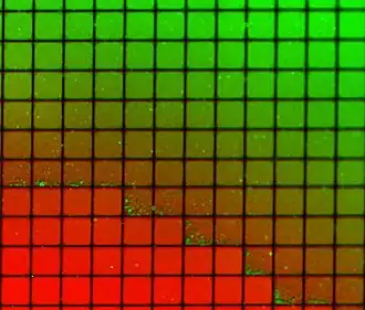 Another important capability of supported bilayers is the ability to pattern the surface to produce multiple isolated regions on the same substrate. This phenomenon was first demonstrated using scratches or metallic “corrals” to prevent mixing between adjacent regions while still allowing free diffusion within any one region.[23][24] Later work extended this concept by integrating microfluidics to demonstrate that stable composition gradients could be formed in bilayers,[25] potentially allowing massively parallel studies of phase segregation, molecular binding and cellular response to artificial lipid membranes. Creative utilization of the corral concept has also allowed studies of the dynamic reorganization of membrane proteins at the synaptic interface.[26]