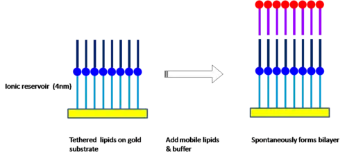 The advantage of this approach is that because of the hydrophilic space of around 4 nm, the interaction with the substrate is minimal and the extra space allows the introduction of protein ion channels into the bilayer. Additionally the spacer layer creates an ionic reservoir[36] that readily enables ac electrical impedance measurement across the bilayer.