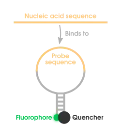 Molecular beacons, or molecular beacon probes, are oligonucleotide hybridization probes that can report the presence of specific nucleic acids in homogenous solutions. Molecular beacons are hairpin-shaped molecules with an internally quenched fluorophore whose fluorescence is restored when they bind to a target nucleic acid sequence. This is a novel non-radioactive method for detecting specific sequences of nucleic acids. They are useful in situations where it is either not possible or desirable to isolate the probe-target hybrids from an excess of the hybridization probes.