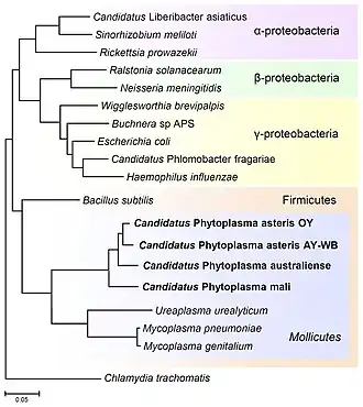Phylogenetic position of Mollicutes among bacteria, using 16S rRNA sequences.[10]