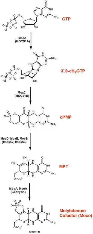 - ↑ Mendel, R. R.; Leimkuehler, S. (2015). "The biosynthesis of the molybdenum cofactors". J. Biol. Inorg. Chem. 20 (2): 337–347. doi:10.1007/s00775-014-1173-y. PMID 24980677. S2CID 2638550.