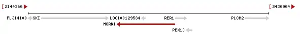 MORN1 is nearby the SKI gene which encodes the SKI protein, LOC100129534, and RER1 gene on the positive strand of chromosome 1. On the minus strand, the PEX10 gene occurs further upstream of Morn1.