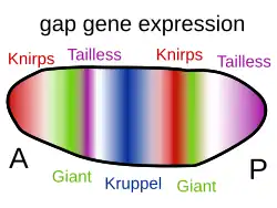 Morphogenesis is controlled by a "toolkit" of genes which switch development on and off at precise times and places. Here, gap genes in the fruit fly are switched on by genes such as bicoid, setting up stripes which create the body's segmental form.