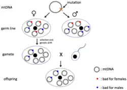 - Paternal leakage – Although mtDNA is thought to be exclusively maternally inherited, paternal inheritance exists in a low frequency of 10−4 relative to maternal inheritance in mice.[10] Hence, selection can act on male-specific deleterious mutations when they are paternally inherited, decreasing their frequency.