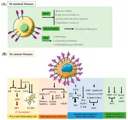 MUC-1 is over expressed in many forms of cancer.[14] Given, MUC-1 is 10 times higher in cancer cells than normal cells,[16] an over expression of MUC-1 in cancer can be indicative of aggressive, metastatic cancer, having a low response to therapy and survival rate.[5] MUC-1 also exhibits altered glycosylation and aberrant surface distribution patterns in tumor cells.[6] Tumor related MUC-1 disrupts and inhibits cell-cell and cell-matrix interactions and adherence.[6] Inhibition of cellular interactions diminishes the adherence of immune effector cells to malignant cells, thereby creating an immunosuppressive effect.[6] MUC-1 in cancerous epithelial cells exhibits a loss of polarity. This loss of polarity creates incomplete carbohydrate side chains, allowing the formation of new abnormal side chains, thus increasing tumorigenesis.[10] In normal cells, MUC-1 is isolated to the apical surface of the cell. In cancer cells, over expression of MUC-1 is seen throughout the cell's nucleus, plasma membrane and cytoplasm.[5] In addition to the membranous isoform, an alternatively spliced mucin-1 is secreted extracellularly.[17]