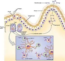 In the gut, lymphoid tissue is dispersed in gut-associated lymphoid tissue (GALT). A large number of immune system cells in the intestines are found in dome-like structures called Peyer’s patches and in small mucosal lymphoid aggregates called cryptopatches.[14] Above the Peyer’s patches is a layer of epithelial cells, which together with the mucus form a barrier against microbial invasion into the underlying tissue. Antigen sampling is a key function of Peyer’s patches. Above the Peyer’s patches is a much thinner mucus layer that helps the antigen sampling.[14] Specialized phagocytic cells, called M cells, which are found in the epithelial layer of the Peyer’s patches, can transport antigenic material across the intestinal barrier through the process of transcytosis.[15] The material transported in this way from the intestinal lumen can then be presented by the antigen-presenting cells present in Peyer’s patches.[14][15] In addition, dendritic cells in Peyer’s patches can extend their dendrites through M cell-specific transcellular pores and they can also capture translocated IgA immune complexes.[16] Dendritic cells then present the antigen to naïve T cells in the local mesenteric lymph nodes.[17]