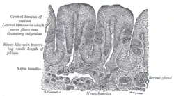 ![]() Vertical section of foliate papilla of the rabbit, passing across the folia. (Serous gland labeled at bottom right.) | |