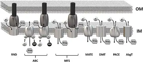 There are five major classes of efflux pumps in bacteria: the ATP-binding cassette (ABC) superfamily, the resistance nodulation division (RND) superfamily, the major facilitator superfamily (MFS), the small multidrug resistance (SMR) superfamily, and the multidrug and toxic compound extrusion (MATE) family. There are also two minor classes: the proteobacterial antimicrobial compound efflux (PACE) family, and the p-aminobenzoyl-glutamate transporter (AbgT) family.[3] The ABC superfamily uses ATP as an energy source for export while the rest of the efflux pumps use proton motive force. Between them, the efflux pump classes cover a wide range of substrate specificities and are involved in numerous cellular processes including cell-to-cell communication, biofilm formation, virulence, and impart cellular protection through extrusion of toxic metabolic byproducts, toxic compounds, and clinical antibiotics.