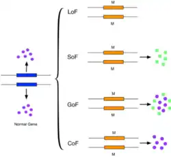 - Gain-of-function mutations also called activating mutations, change the gene product such that its effect gets stronger (enhanced activation) or even is superseded by a different and abnormal function. When the new allele is created, a heterozygote containing the newly created allele as well as the original will express the new allele; genetically this defines the mutations as dominant phenotypes. Several of Muller's morphs correspond to the gain of function, including hypermorph (increased gene expression) and neomorph (novel function).