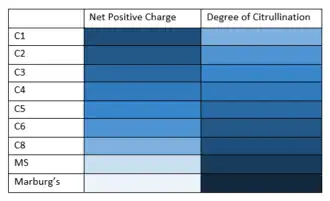 As implied by its name, myelin basic protein is significantly basic, with an isoelectric point of 10. It is thought to associate with the cell membrane through electrostatic interactions between its positive charges and negatively charged phospholipid heads of the plasma membrane.[18] It can undergo a large variety of post-translational modifications, creating various charge isomers known as C1-C6 or C8.[19] These modifications include phosphorylation, methylation, deamidation, citrullination, ADP-ribosylation, and N-terminal acylation . C1 is the least modified, while C8 is the most distinct, containing 6-11 additional citrullinations. Since each of these decreases its positive charge, C8 has the smallest net positive charge of the isomers. Alternations in these post-translational modifications have been associated with demyelinating diseases. Notably, MBP isolated from individuals with multiple sclerosis have had a higher degree of citrullination and a smaller positive charge. In a rare, severe form of MS known as Marburg's syndrome, the citrullination was even more extensive.[18]