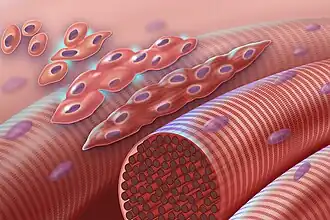 Satellite cells are described as quiescent myoblasts and neighbor muscle fiber sarcolemma.[3] They are crucial for the repair of muscle, but have a very limited ability to replicate. Activated by stimuli such as injury or high mechanical load, satellite cells are required for muscle regeneration in adult organisms.[3] In addition, satellite cells have the capability to also differentiate into bone or fat. In this way, satellite cells have an important role in not only muscle development, but in the maintenance of muscle through adulthood.[3]