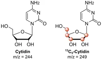 - ↑ Kellner, Stefanie; Ochel, Antonia; Thüring, Kathrin; Spenkuch, Felix; Neumann, Jennifer; Sharma, Sunny; Entian, Karl-Dieter; Schneider, Dirk; Helm, Mark (16 August 2014). "Absolute and relative quantification of RNA modifications via biosynthetic isotopomers". Nucleic Acids Research. 42 (18): e142. doi:10.1093/nar/gku733. ISSN 1362-4962. PMC 4191383. PMID 25129236.