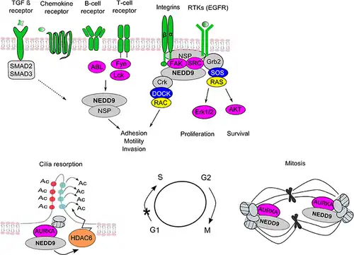 NEDD9 binds directly to the Aurora-A mitotic kinase at the centrosome, and promotes its activity, allowing cells to enter mitosis.[43][80] Degradation of NEDD9 at the end of mitosis contributes to timely Aurora-A degradation.[43][80][81] Cells overexpressing NEDD9 exhibit deficient cytokinesis resulting in the accumulation of multipolar mitotic spindles and abnormal numbers of centrosomes. On the other hand, cells with depleted NEDD9 have prematurely separated centrosomes and are deficient in microtubule organizing activity during mitosis, leading to an abundance of monopolar or asymmetric spindles,[43] preventing cells from entering mitosis. NEDD9 also regulates Aurora-A activation at the basal body of cilia as cells resorb cilia during early G1.[57] Cilia are small organelles that protrude from the surface of adherent cells that are the obligate site of action for proteins such as Hedgehog, and the polycystins: by influencing ciliary stability, NEDD9 is positioned to affect these signaling systems. Interaction of NEDD9 with Aurora A kinase may also play a role in tumor invasion. NEDD9 binds to and regulates acetylation of cortactin (CTTN) in an Aurora A kinase (AURKA)/HDAC6–dependent manner. The knockdown of NEDD9 or AURKA results in an increase in the amount of acetylated CTTN and a decrease in the binding of CTTN to F-actin. Overexpression of the deacetylation mimicking (9KR) mutant of CTTN is sufficient to restore actin dynamics at the leading edge and migration proficiency of the tumor cells. Inhibition of AURKA and HDAC6 activity by alisertib and tubastatin A in xenograft models of breast cancer has led to a decrease in the number of pulmonary metastases.[82]