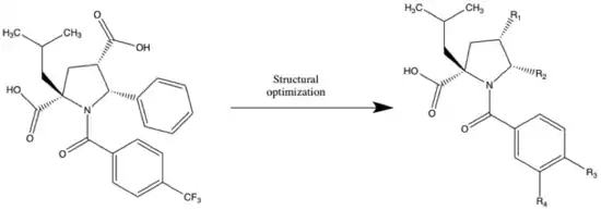In 2005 GlaxoSmithKline identified N-benzoyl pyrrolidine as a NS5B inhibitor through high-throughput screening. An isobutyl analog (table 2) showed IC50=0.7 μM submicromolar activity against NS5B. In the development, 5-phenyl was replaced with different heterocycles to try to optimize the inhibition, compounds (2-4). The 2-pyridyl (4) group was well tolerated on the pyrrolidine scaffold, whereas replacement with 2-thienyl led to compound (5) with IC50= 0,3 μM. To get a high degree of enantiospecificity for the enzyme-inhibitor reaction, a (+) enantiomer of (5) was determined to be more potent than its (–) counterpart. These compounds all bind to the palm region of the NS5B polymerase in an allosteric pocket. Further developments were made by Burton G in 2007 to optimize the acyl pyrrolidine scaffold to achieve replicon activity. Replacing thiophene with thiazole in N-acyl pyrrolidine scaffold produced analog (6) to achieve great enzyme activity, IC50=40nM.[25] Nonetheless, this series of compounds had low cellular permeability. The most potent analog during the optimization of cellular activity of this series was (7) with IC50 = 5nM and EC50 = 0.61 μM.[26] The problem with this compound (7) was poor oral bioavailability and poor absorption. To achieve a better pharmacokinetic profile, modifications to the structure led to compound (8) with EC50 of 0.39 μM and an oral bioavailability of about 50%. This compound was then selected as a drug candidate for further development as a combination therapy with peginterferon alfa-2a.[3]
