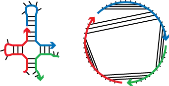 The secondary structure of multiple interacting strands is defined by a list of base pairs.[3] A polymer graph for a secondary structure can be constructed by ordering the strands around a circle, drawing the backbones in succession from 5’ to 3’ around the circumference with a nick between each strand, and drawing straight lines connecting paired bases. A secondary structure is pseudoknotted if every strand ordering corresponds to a polymer graph with crossing lines. A secondary structure is connected if no subset of the strands is free of the others. Algorithms are formulated in terms of ordered complexes, each corresponding to the structural ensemble of all connected polymer graphs with no crossing lines for a particular ordering of a set of strands. The free energy of an unpseudoknotted secondary structure is calculated using nearest-neighbor empirical parameters for RNA in 1M Na+[4][5] or for DNA in user-specified Na+ and Mg++ concentrations;[6][7][8] added parameters are employed for the analysis of pseudoknots (single RNA strands only).[9][10]