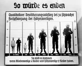 The social policies of eugenics in Nazi Germany were composed of various ideas about genetics. The racial ideology of Nazism placed the biological improvement of the German people by selective breeding of "Nordic" or "Aryan" traits at its center.[1] These policies were used to justify the involuntary sterilization and mass-murder of those deemed "undesirable".