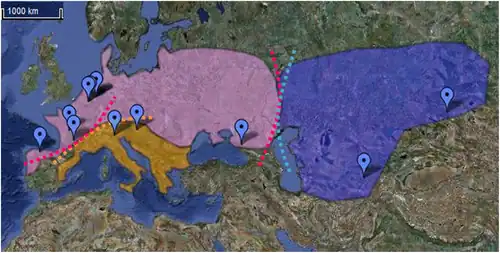 Genetic analysis indicates there were at least three distinct geographical groups: Western Europe, the Mediterranean coast, and east of the Caucasus, with some migration among these regions.[35] Over long periods of time, there is evidence of large-scale cross-continental migration. Early specimens from Mezmaiskaya Cave in the Caucasus and Denisova Cave in the Siberian Altai Mountains differ genetically from Western European Neanderthals, whereas later specimens from these caves both have genetic profiles more similar to Western European Neanderthals than to the earlier specimens from the same locations. These suggest large-scale population replacement over time.[40][41]