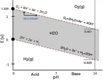 Note that the slopes of the two water stability domain upper and lower lines are the same (−59.16 mV/pH unit), so they are parallel on a Pourbaix diagram. As the slopes are negative, at high pH, both hydrogen and oxygen evolution requires a much lower reduction potential than at low pH.