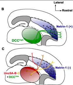 Studies of central nervous system (CNS) development in chick and rodent models have identified the netrin-1 protein as a particularly important vertebrate axonal guidance cue. Most significantly, it was observed that the specialized cells of the floor plate located at the ventral midline of the embryonic brain secrete netrin-1, which resulted in a protein gradient. This gradient is most concentrated at the ventral midline and becomes increasingly diffuse as you move dorsally. Additional research in netrin deficient mice found that when netrin associates with the Deleted in Colorectal Cancer (DCC) receptor on the axonal growth cone an attractant response is initiated. This was further supported by an observed absence of ventral commissure (i.e. corpus callosum) development in mice lacking either netrin-1 or DCC. Similar results were observed in experiments with the netrin-1 homolog UNC-6 discovered in C. elegans[9] The same early expression and formation of a protein concentration gradient emanating from the ventral midline is observed in epidermal cells of the developing worm. Evidence suggests that this gradient is essential for the long-range function of UNC-6 in guiding the initial circumferential migration of axons to the ventral midline and that the UNC-40 receptor mediates the attractive response. As additional axons reach the midline, the temporal and spatial expression of UNC-6 becomes increasing restricted, indicating that after a more general dorsal-ventral guidance of axons, UNC-6 is further involved in directing axons to more specific locations.[5][10]