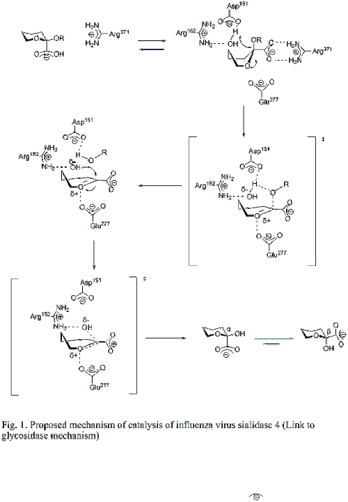 The enzymatic mechanism of influenza virus sialidase has been studied by Taylor et al., shown in Figure 1. The enzyme catalysis process has four steps. The first step involves the distortion of the α-sialoside from a 2C5 chair conformation (the lowest-energy form in solution) to a pseudoboat conformation when the sialoside binds to the sialidase. The second step leads to an oxocarbocation intermediate, the sialosyl cation. The third step is the formation of Neu5Ac initially as the α-anomer, and then mutarotation and release as the more thermodynamically stable β-Neu5Ac.[12]