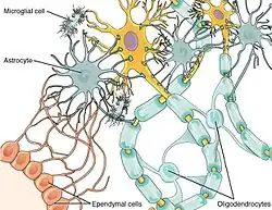 - ↑ Nair, Aji; Frederick, Terra; Miller, Stephen (September 2008). "Astrocytes in Multiple Sclerosis: a Product of their environment". Cellular and Molecular Life Sciences. 65 (17): 2702–20. doi:10.1007/s00018-008-8059-5. PMC 2858316. PMID 18516496.