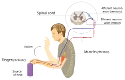 The withdrawal reflex is a reflex that protects an organism from harmful stimuli.[13] This reflex occurs when noxious stimuli activate nociceptors that send an action potential to nerves in the spine, which then innervate effector muscles and cause a sudden jerk to move the organism away from the dangerous stimuli.[11] The withdrawal reflex involves both the nervous and immune systems.[11] When the action potential travels back down the spinal nerve network, another impulse travels to peripheral sensory neurons that secrete amino acids and neuropeptides like calcitonin gene-related peptide (CGRP) and Substance P.[11][13] These chemicals act by increasing the redness, swelling of damaged tissues, and attachment of immune cells to endothelial tissue, thereby increasing the permeability of immune cells across capillaries.[11][13]