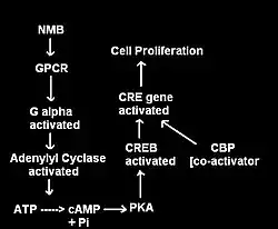 When NMB binds to its 7-TMR, the heterotrimeric G protein that is attached to the receptor is activated. The G-protein is called heterotrimeric because it consists of 3 polypeptides: α subunit, β subunit, and γ subunit. In the activated NMBR/G-protein complex, there occurs an exchange of GTP for GDP bound to G-α subunit. The G-α subunit, in turn, dissociated form the G-βγ subunits. The free G-α inactivates adenylate cyclase (AC), which, in turn, catalyzes the conversion of ATP to cAMP, the latter of which functioning as a second messenger. cAMP activates of the enzyme Protein Kinase A (PKA). PKA enters the nucleus and activates the cAMP response element-binding protein. The activated CREB binds along with CREB binding protein, co-activator to the CRE region of the DNA in the nucleus. CREB and CBP are held together by leucine zippers. CRE is the control that activates number of growth factors, and thus cell proliferation and some anti-apoptotic genes. In the brain, CREB plays a role in long-term memory and learning.