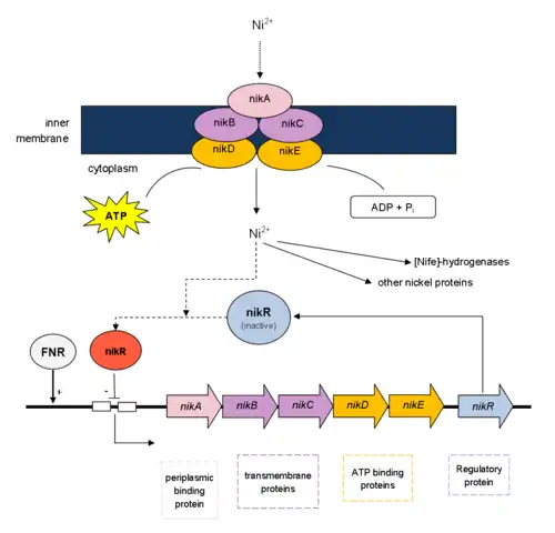 Ni2+ is taken up into prokaryotic cells by one of two types of high-affinity transport systems.[3] The first method involves ABC-type transporters (discussed in this article) and the second mechanism makes use of transition-metal permeases (such as HoxN of Ralstonia eutropha). The ABC-type transporter system consists of five proteins, NikA–E, that carry out the ATP-dependent transport of Ni2+.[1] NikA is a soluble, periplasmic, Ni-binding protein; NikB and NikC form a transmembrane pore for passage of Ni; and NikD and NikE hydrolyze ATP and couple this energy to Ni2+-transport. When Ni2+ is available in excess, NikR protein represses transcription of nikABCDE.[2]