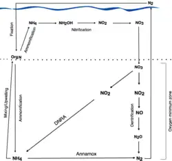 Organisms reduce nitrate (NO3−) to nitrogen gas (N2) through the process of denitrification, see Figure 1.[1][2] Two important intermediates of the reduction pathway are nitric oxide (NO) and nitrous oxide (N2O).[1][2] The reducing reaction that transforms NO into N2O is catalyzed by nitric oxide reductase (NOR).[1][2][3][4]