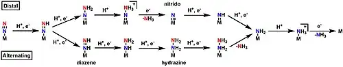 While the mechanism for nitrogen fixation prior to the Janus E4 complex is generally agreed upon, there are currently two hypotheses for the exact pathway in the second half of the mechanism: the "distal" and the "alternating" pathway.[9][24][25] In the distal pathway, the terminal nitrogen is hydrogenated first, releases ammonia, then the nitrogen directly bound to the metal is hydrogenated. In the alternating pathway, one hydrogen is added to the terminal nitrogen, then one hydrogen is added to the nitrogen directly bound to the metal. This alternating pattern continues until ammonia is released.[9][24][25] Because each pathway favors a unique set of intermediates, attempts to determine which path is correct have generally focused on the isolation of said intermediates, such as the nitrido in the distal pathway,[26] and the diazene and hydrazine in the alternating pathway.[9] Attempts to isolate the intermediates in nitrogenase itself have so far been unsuccessful, but the use of model complexes has allowed for the isolation of intermediates that support both sides depending on the metal center used.[9] Studies with Mo generally point towards a distal pathway, while studies with Fe generally point towards an alternating pathway.[9][24][25][27][28]