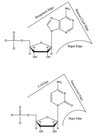 Each base has three potential edges where it can interact with another base. The Purine bases have 3 edges which are able to hydrogen bond. Those are known as the Watson-Crick edge(WC), the Hoogsteen edge(H), and the Sugar edge(S). Pyrimidine bases also have three hydrogen-bonding edges.[28] Like the purine, there is the Watson-Crick edge(WC) and the Sugar edge(S) but the third edge is referred to as the "C-H" edge(H) on the pyrimidine bases. This C-H edge is sometimes also referred to as the Hoogsteen edge for simplicity. The various edges for the purine and pyrimidine bases are shown in Figure 2.[59]