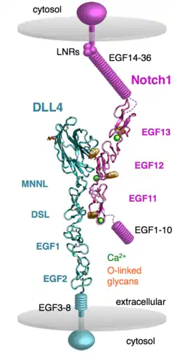 Notch signaling is initiated when Notch receptors on the cell surface engage ligands presented in trans on opposing cells. Despite the expansive size of the Notch extracellular domain, it has been demonstrated that EGF domains 11 and 12 are the critical determinants for interactions with Delta.[37] Additional studies have implicated regions outside of Notch EGF11-12 in ligand binding. For example, Notch EGF domain 8 plays a role in selective recognition of Serrate/Jagged[38] and EGF domains 6-15 are required for maximal signaling upon ligand stimulation.[39] A crystal structure of the interacting regions of Notch1 and Delta-like 4 (Dll4) provided a molecular-level visualization of Notch-ligand interactions, and revealed that the N-terminal MNNL (or C2) and DSL domains of ligands bind to Notch EGF domains 12 and 11, respectively.[40] The Notch1-Dll4 structure also illuminated a direct role for Notch O-linked fucose and glucose moieties in ligand recognition, and rationalized a structural mechanism for the glycan-mediated tuning of Notch signaling.[40]