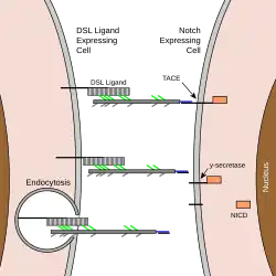 Once the notch extracellular domain interacts with a ligand, an ADAM-family metalloprotease called ADAM10, cleaves the notch protein just outside the membrane.[34] This releases the extracellular portion of notch (NECD), which continues to interact with the ligand. The ligand plus the notch extracellular domain is then endocytosed by the ligand-expressing cell. There may be signaling effects in the ligand-expressing cell after endocytosis; this part of notch signaling is a topic of active research. After this first cleavage, an enzyme called γ-secretase (which is implicated in Alzheimer's disease) cleaves the remaining part of the notch protein just inside the inner leaflet of the cell membrane of the notch-expressing cell. This releases the intracellular domain of the notch protein (NICD), which then moves to the nucleus, where it can regulate gene expression by activating the transcription factor CSL. It was originally thought that these CSL proteins suppressed Notch target transcription. However, further research showed that, when the intracellular domain binds to the complex, it switches from a repressor to an activator of transcription.[35] Other proteins also participate in the intracellular portion of the notch signaling cascade.[36]