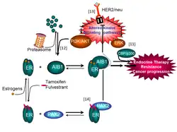 Several molecular mechanisms implicate NCOA3 (AIB1) in the endocrine therapy resistance (depicted in the figure). Signaling pathways or mutations (i.e. HER2/neu overexpression, activating mutations in PIK3CA (PI3K), activating mutations in the proto-oncogene tyrosine-protein kinase Src, etc.) that lead to persistent activation of ERK and/or PIK3CA/AKT kinase pathways result, in one hand in an enhanced AIB1 transcriptional coactivation capacity,[11] and in the other hand in the inhibition of the proteasome-dependent AIB1 turn-over and therefore, in AIB1 overexpression.[12] In both conditions, the equilibrium of estrogen receptor (ER) complex formation is displaced towards a transcriptionally active complex and thus, counteracting the inhibition caused by anti-estrogenic drugs such as tamoxifen or fulvestrant (selective estrogen receptor modulators). The result is the restoration of estrogen-sensitive gene transcription and the promotion of cancer progression and/or relapse.