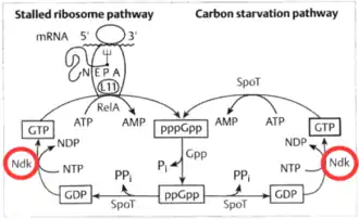 In the (p)ppGpp biosynthesis cycle, NDPK serves an important role. When there is an absence of a charged tRNA in the A site of a ribosome, the ribosome will stall and trigger the synthesis of the guanosine pentaphosphate ((p)ppGpp) molecule. (p)ppGpp biosynthesis is a part of the purine metabolism pathway and coordinates a series of cellular activities in response to nutritional abundances.[11] Synthesis of (p)ppGpp is triggered by carbon starvation, or the lack of carbon in the cell's environment, and causes the protein SpoT to activate. SpoT works in conjunction with NDPK and both serve as essential enzymes in the (p)ppGpp biosynthesis cycle. NDPK synthesizes the formation of GDP from GTP via dephosphorylation.[12]