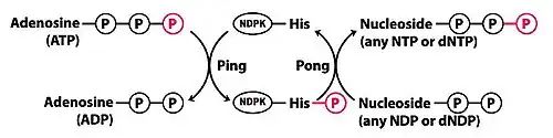 NDPK are found in all cells, displaying not much specificity towards the types of nucleoside bases and are capable of accepting nucleotides and deoxyribonucleotides as substrates or donors.[3] Therefore, NDPK is the source of RNA and DNA precursors, except ATP.[4] NDPK utilize specific enzyme kinetics for multi-substrate reaction, namely ping-pong mechanism. A ping-pong mechanism integrates phosphorylation of a histidine residue by transferring terminal phosphate group (γ-phosphate) from ATP to NDP β-phosphate in order to produce a NTP, and NDPK catalyzes such reversible reactions.[5] NTP phosphorylates a histidine, which in turn phosphorylates NDP. NDPK are involved in the synthesis of nucleoside triphosphates (NTP), such as guanosine triphosphate (GTP), cytidine triphosphate (CTP) and uridine triphosphate (UTP), thymidine triphosphate (TTP).[6]