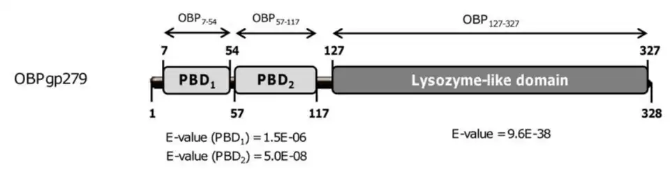 The catalytic domain of the enzyme resides on the C-terminal region of the enzyme. OBPgp279 is also predicted to contain peptidoglycan binding domains; since OBPgp279 contains two peptidoglycan binding domain motifs in its N-terminal region (general sequence motif=D-G-(Pho)2-G-K/N-G/N-T, Pho = hydrophobic amino acid), it likely contains two peptidoglycan binding domains as shown in the schematic drawing below.[1][8]