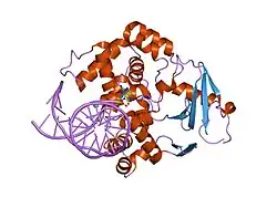 - ↑ Marsin S, Vidal AE, Sossou M, Ménissier-de Murcia J, Le Page F, Boiteux S, et al. (November 2003). "Role of XRCC1 in the coordination and stimulation of oxidative DNA damage repair initiated by the DNA glycosylase hOGG1". The Journal of Biological Chemistry. 278 (45): 44068–44074. doi:10.1074/jbc.M306160200. PMID 12933815.
